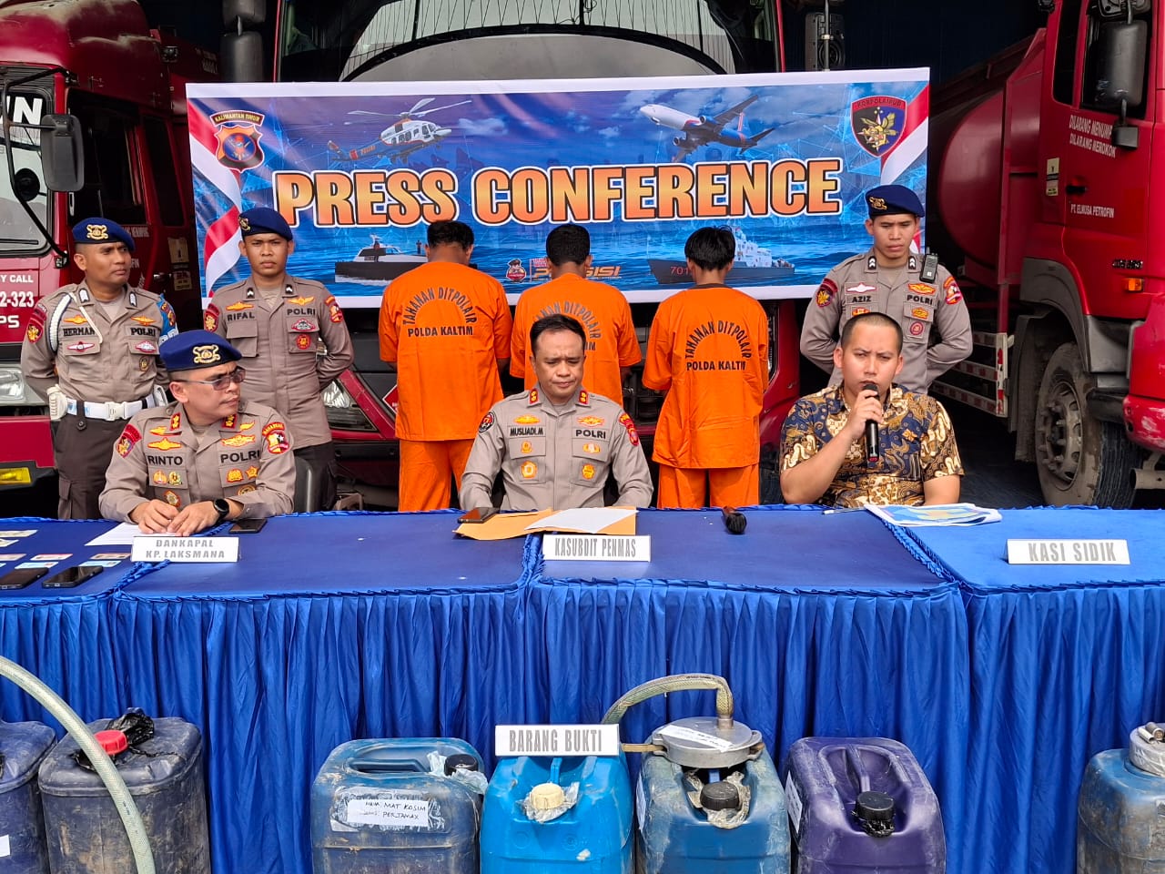 Dalam konferensi pers yang digelar di Hanggar Ditpolairud Polda Kaltim, Komandan Kapal KP. LAKSMANA -7012, AKBP Rinto Haivan Simbolon, mengungkapkan bahwa modus operandi para pelaku adalah dengan membuka segel dan tutup manhole mobil bunker untuk mengambil BBM bersubsidi. Polisi pun langsung melakukan penindakan terhadap tiga orang tersangka, yaitu ED, MK, dan H.