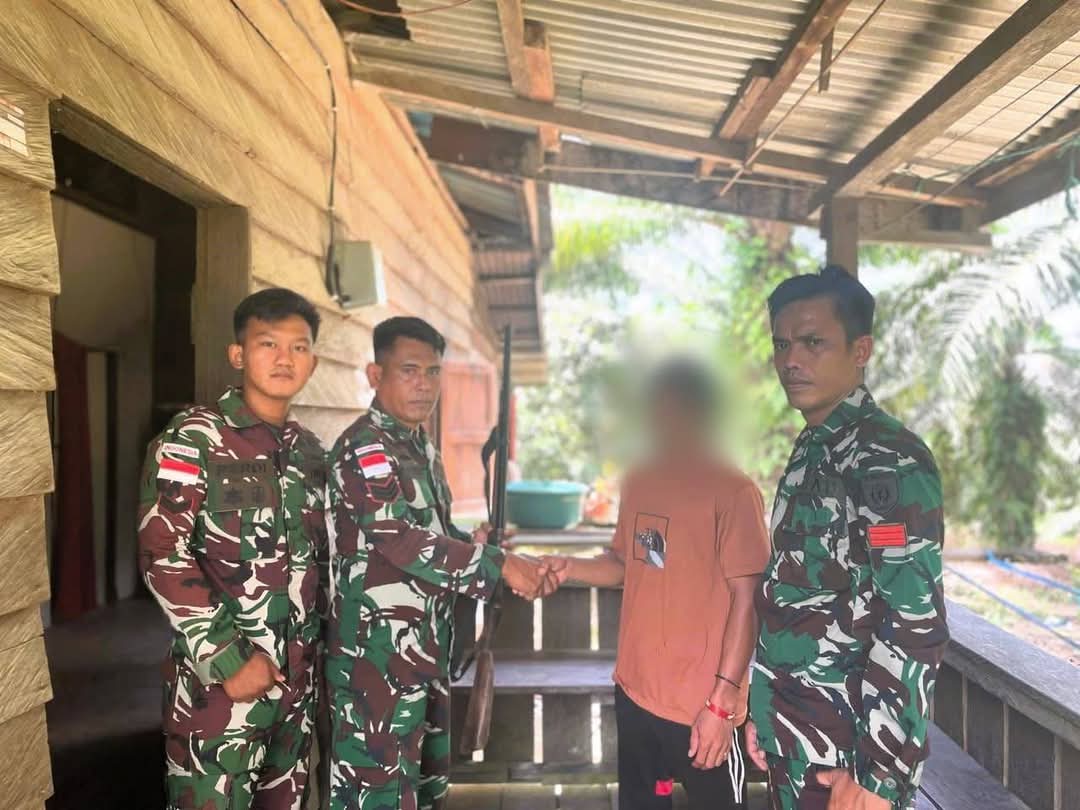 Sekda TV sekdatv.com, Nunukan - Seorang warga Desa Tabur Lestari, Kecamatan Seimanggaris, Kabupaten Nunukan, berinisial A (30), menyerahkan satu pucuk senjata api rakitan laras panjang jenis penabur secara sukarela kepada personel Satgas Pamtas RI–Malaysia Yonarmed 11 Kostrad yang bertugas di Pos Seimanggaris Lama, Minggu (06/04/25).